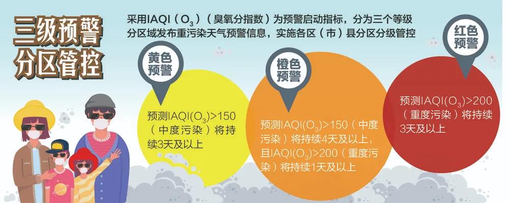 《預(yù)案》分級標(biāo)準(zhǔn)采用IAQI(O3)(臭氧分指數(shù))為預(yù)警啟動(dòng)指標(biāo),由低到高依次分為黃色預(yù)警、橙色預(yù)警、紅色預(yù)警三個(gè)等級。同時(shí),根據(jù)各區(qū)(市)縣空氣質(zhì)量實(shí)況和區(qū)域預(yù)測預(yù)報(bào)分析,還新增了分區(qū)域發(fā)布重污染天氣預(yù)警信息,實(shí)施分區(qū)分級管控。
